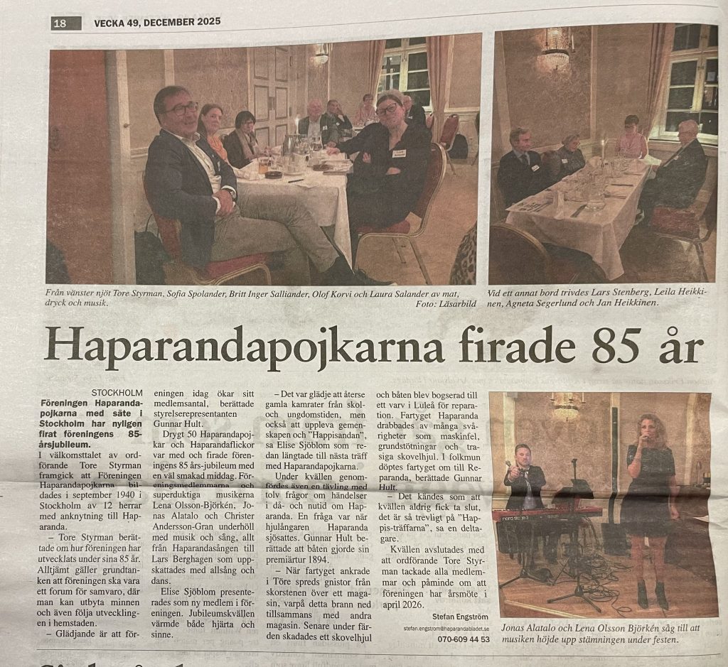 Haparandabladets artikel om 85-årsjubileet i Stockholm.